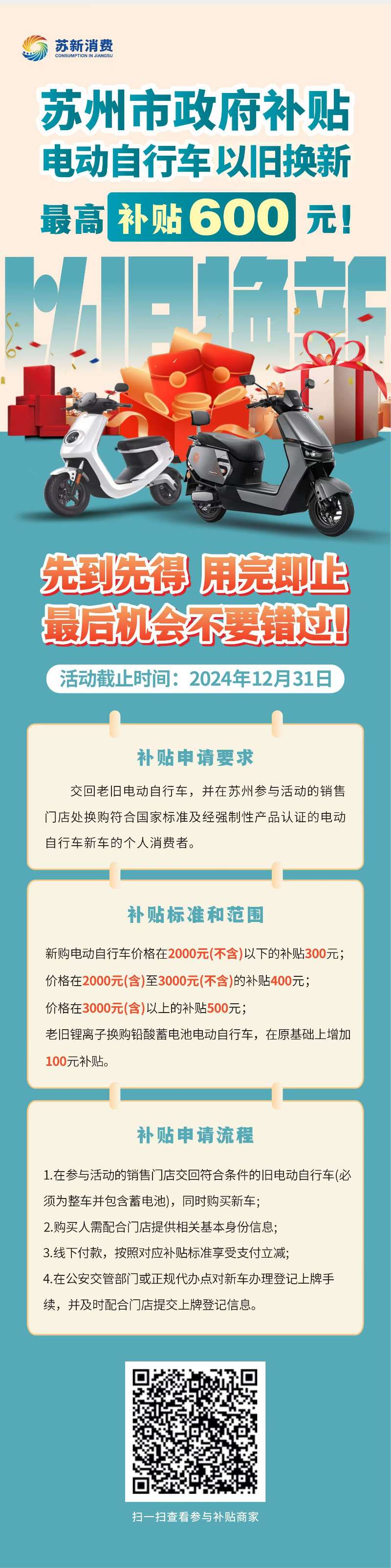 根据《关于调整中央超长期特别国债支持电动自行车以旧换新和家装家居改造资金预算的通知》《苏州市电动自行车以旧换新补贴实施细则》等文件规定,我市电动自行车以旧换新活动已接近尾声。由于补贴资金有限,无法保证所有参与者都可享受到补贴,请有意参与电动自行车以旧换新活动的市民抓紧时间购买,以免错失补贴机会。补贴资金先到先得,用完即止(以最终订单支付成功的时间先后顺序为准)。