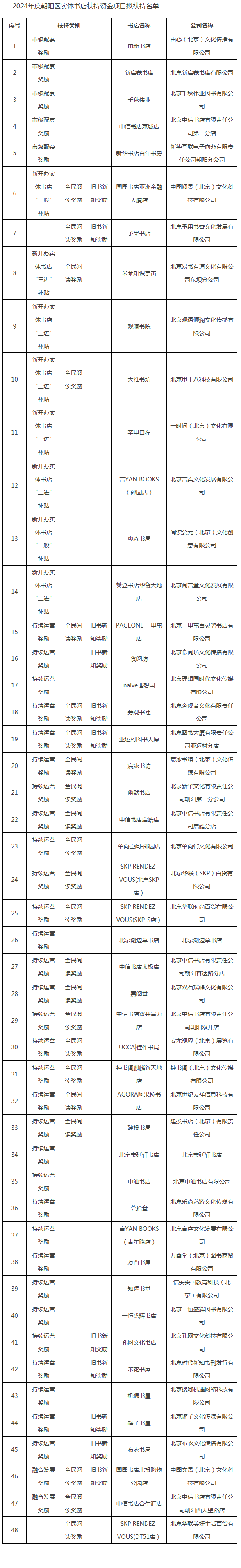 依据《北京市朝阳区关于支持实体书店发展的实施意见》和《朝阳区实体书店扶持资金管理办法(2024修订版)》等有关规定,我部门组织开展了2024年朝阳区实体书店资金扶持工作,经过项目申报、项目初审、现场踏勘、专家评审、部门联审等环节,48家实体书店拟获得2024年度朝阳区实体书店扶持资金扶持(拟扶持名单详见附件)。现将拟扶持单位名单向社会公示,公示日期2025年1月20日至1月26日。