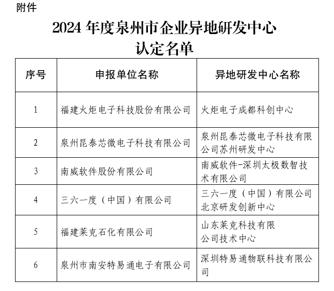 根据《泉州市科学技术局关于开展2024年泉州市企业异地研发中心申报认定工作的通知》(泉科〔2024〕184号),经组织申报、推荐受理、专家评审、现场核实、部门研究、公示等环节,现认定火炬电子成都科创中心等6家单位为“泉州市企业异地研发中心”。