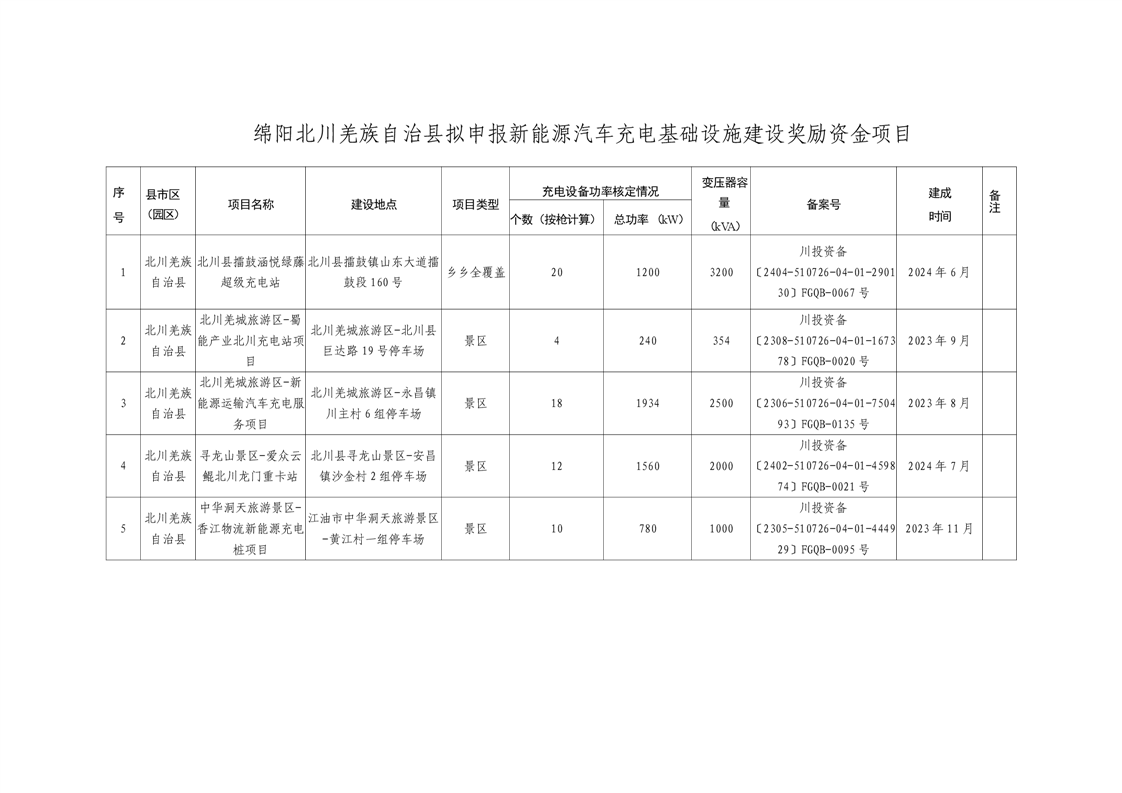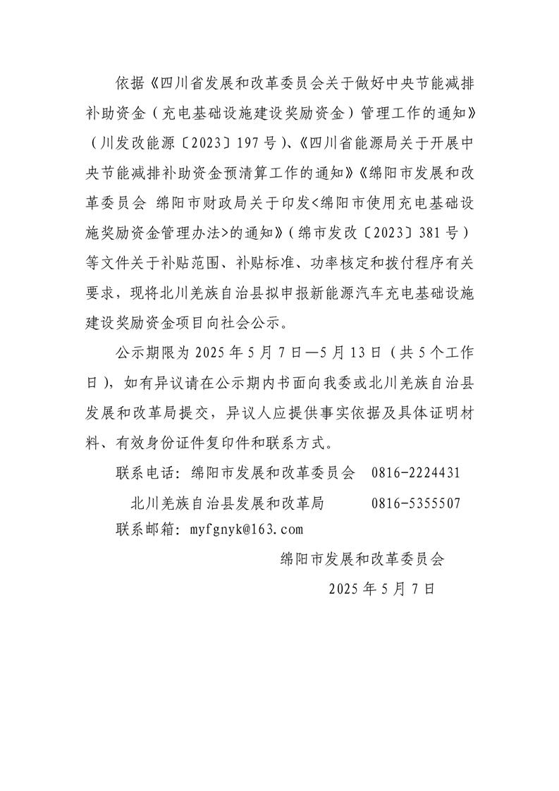 绵阳市发展和改革委员会关于北川羌族自治县拟申报充电基础设施建设奖励资金项目的公示