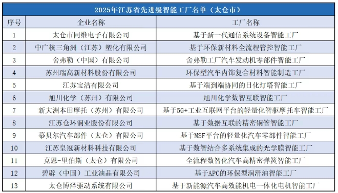 近日,江苏省工信厅公示了2025年江苏省先进级智能工厂名单,太仓市13家企业成功入选。