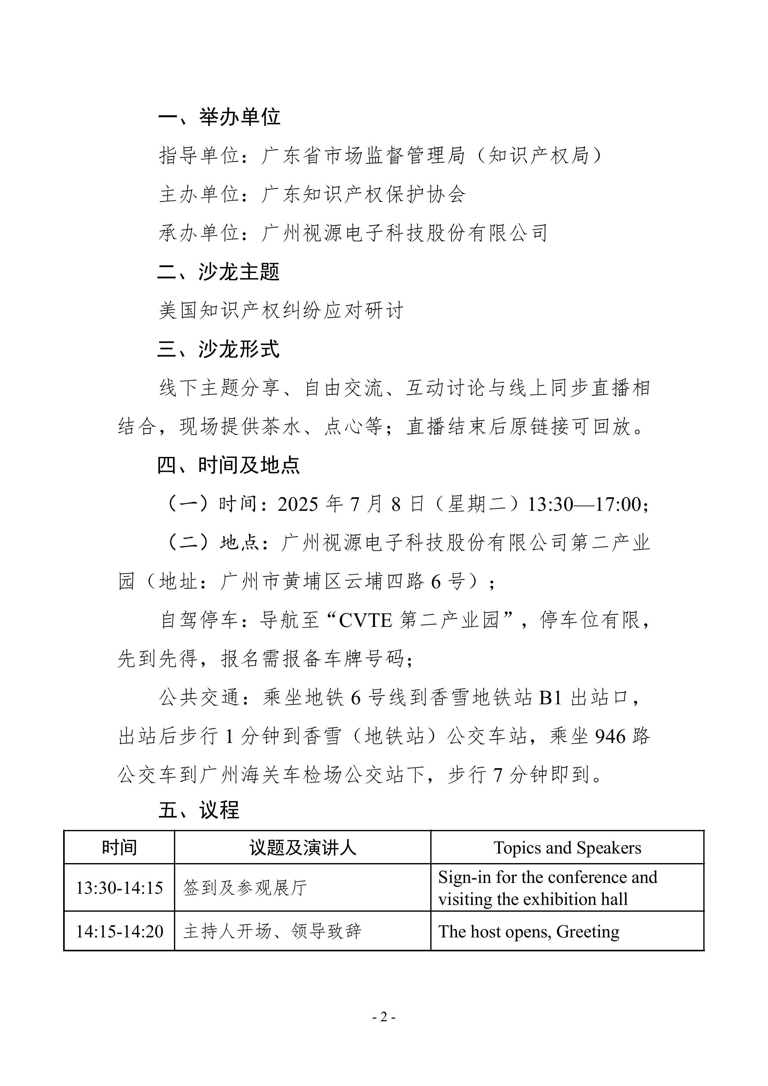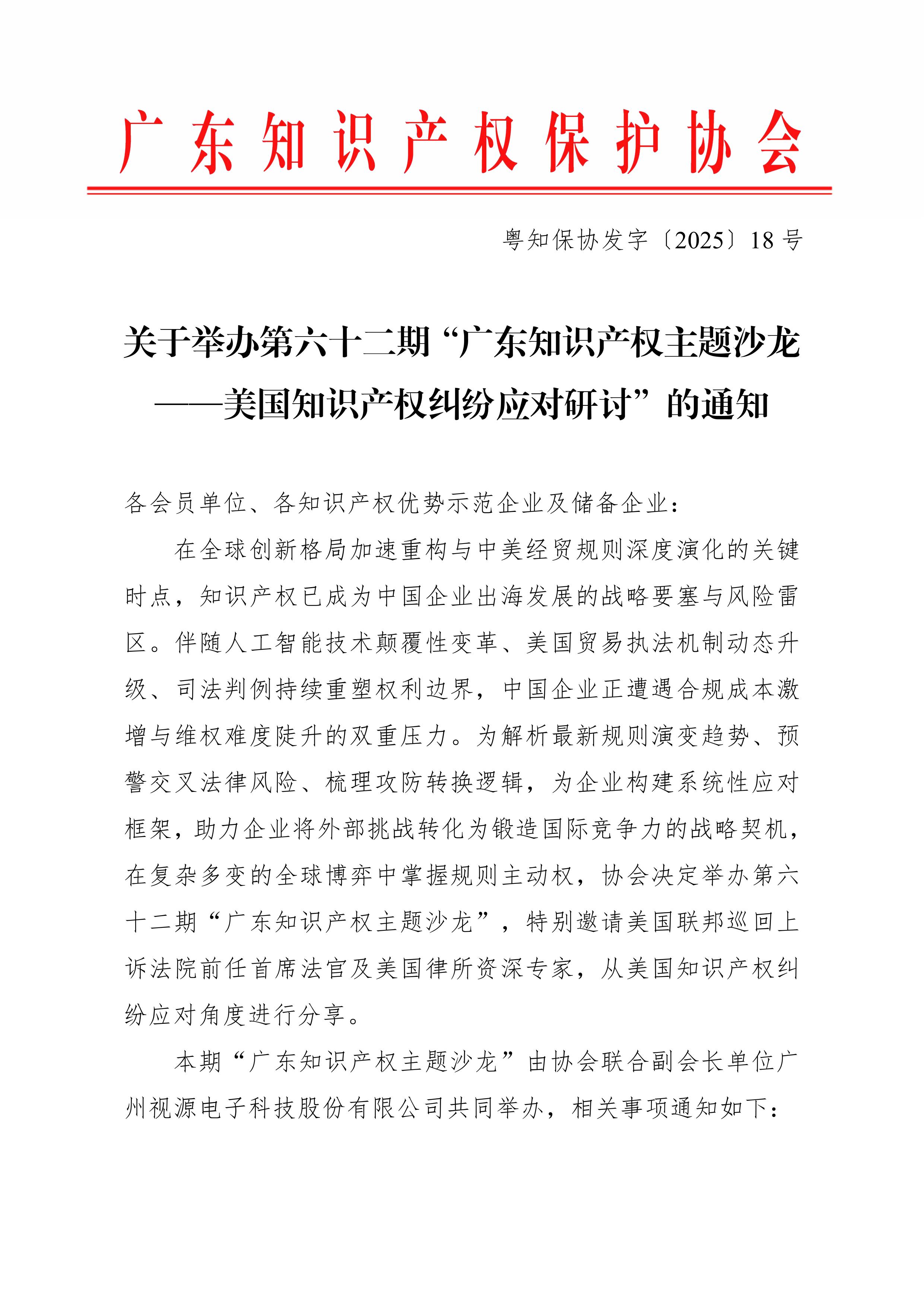 粤知保协发字〔2025〕18号-关于举办第六十二期“广东知识产权主题沙龙——美国知识产权纠纷应对研讨”的通知