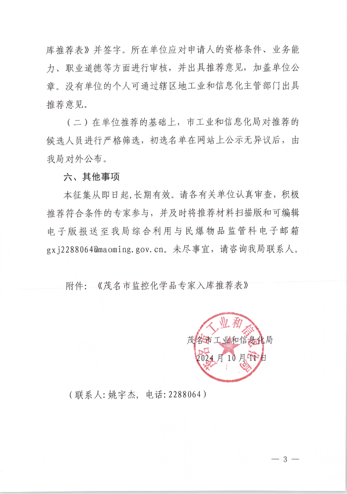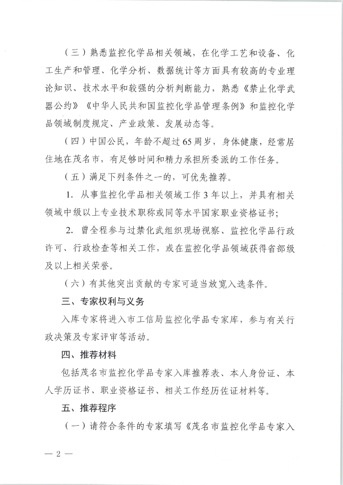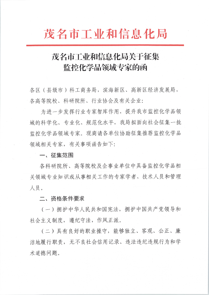 茂名市工业和信息化局关于征集监控化学品领域专家的函