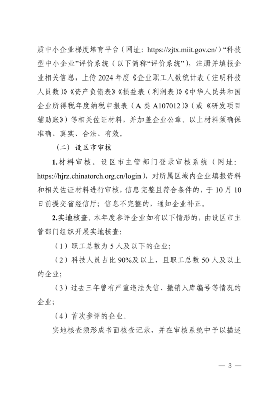 1.企业参评。符合条件的中小企业按照自愿原则,于9月20日前登录优质中小企业梯度培育平台(网址:https://zjtx.miit.gov.cn/)“科技型中小企业”评价系统(以下简称“评价系统”),注册并填报企业相关信息,上传2024年度《企业职工人数统计表(注明科技人员数)》《资产负债表》《损益表(利润表)》《中华人民共和国企业所得税年度纳税申报表(A类A107012)》(或《研发项目辅助账》)等相关佐证材料,并加盖企业公章。以上材料须确保准确、真实、合法、有效。