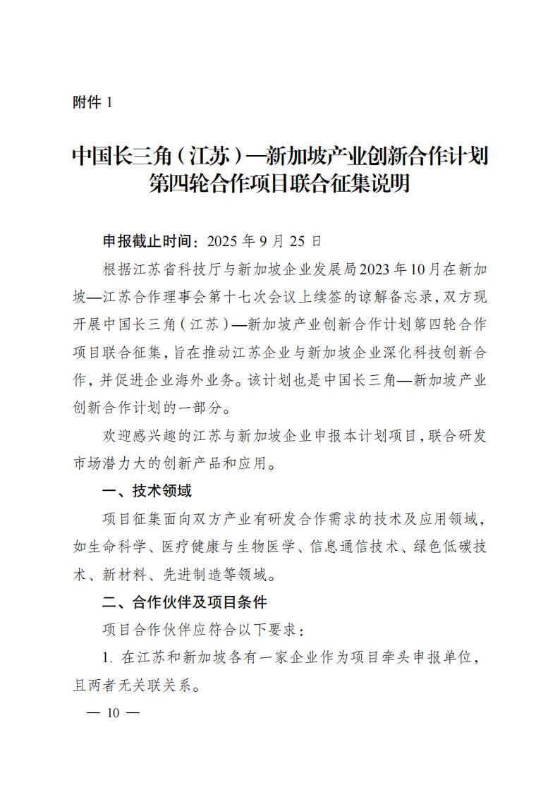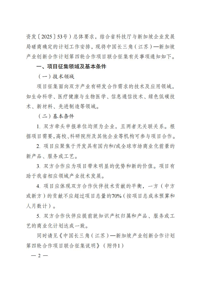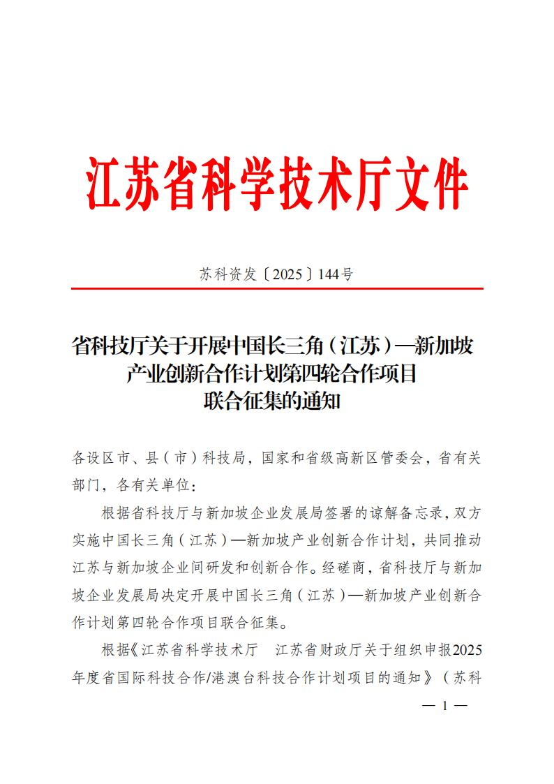 技厅关于开展中国长三角(江苏)—新加坡产业创新合作计划第四轮合作项目 联合征集的通知