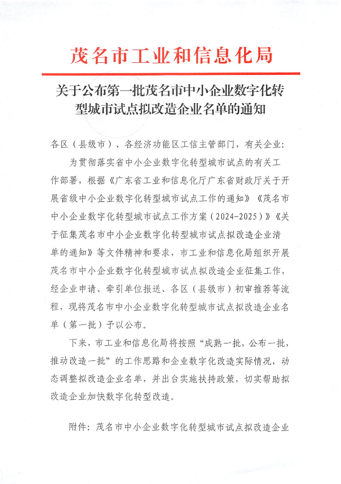 关于公布第一批茂名市中小企业数字化转型城市试点拟改造企业名单的通知