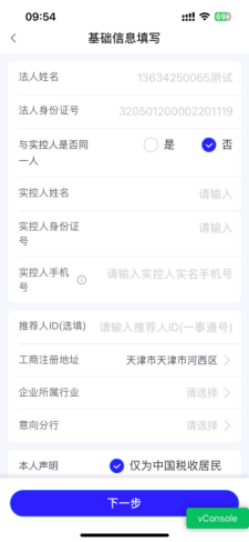 三、APP申请时如果法人和实控人不同,需要输入实控人信息,信息输入完成后点击下一步按要求完成授权。