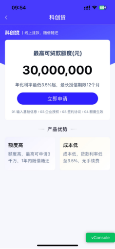 科创易贷。全流程线上审核(一般T+0批复),无人工干预,可随时提款,便捷快速。最高额度300万元。
