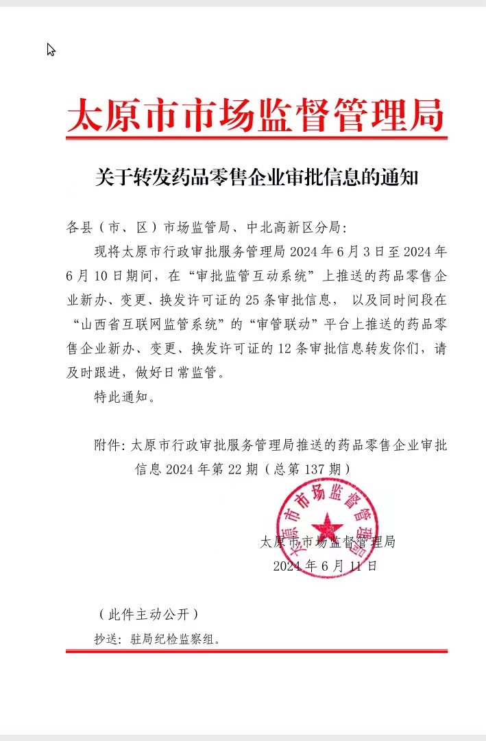 太原市行政审批服务管理局推送的药品零售企业审批信息