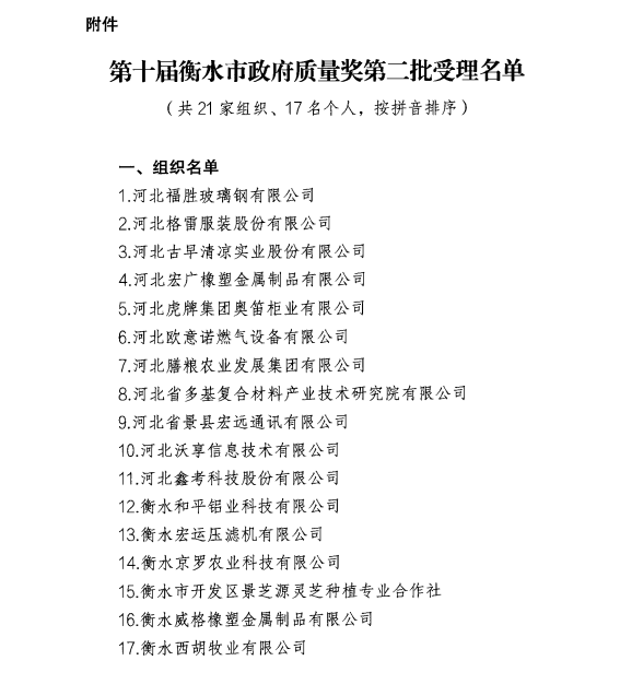 衡水市质量强市战略领导小组办公室关于第十届衡水市政府质量奖第二批受理名单公示