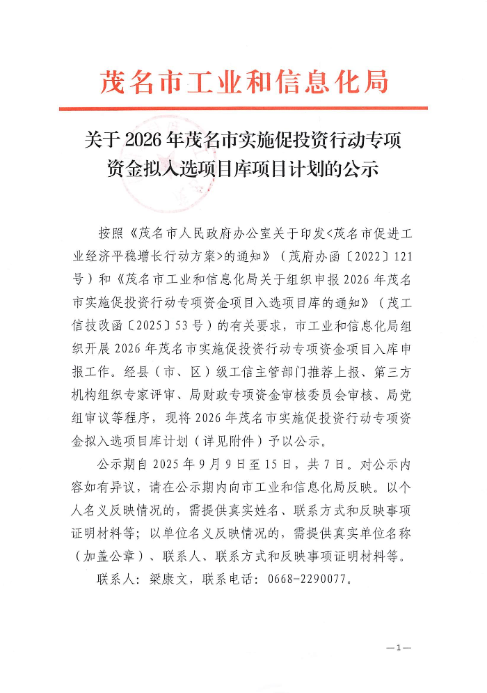 关于2026年茂名市实施促投资行动专项资金拟入选项目库项目计划的公示