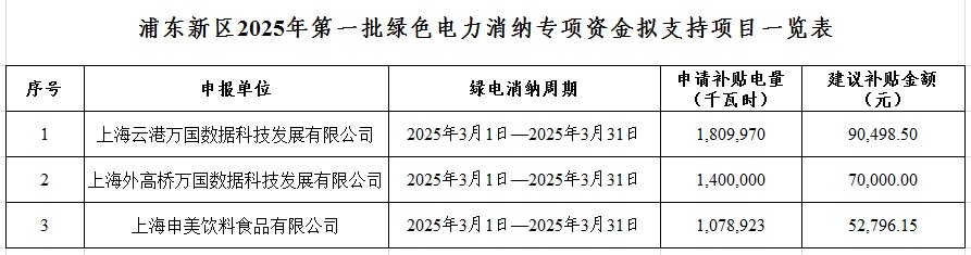 现将浦东新区2025年度第一批绿色电力消纳专项资金拟支持项目予以公示。