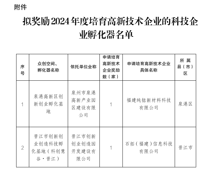 根据《泉州市科学技术局关于开展2024年度科技企业孵化器、众创空间培育高新技术企业奖励申报工作的通知》(泉科〔2025〕82号)和《泉州市支持高新技术企业高质量发展若干措施》(泉政办规〔2025〕8号)“对科技企业孵化器每孵化培育1家首次通过认定的国家高新技术企业,奖励运营单位5万元。”的要求,经申报、现场核实、会议研究等环节,拟对2家培育高新技术企业的科技企业孵化器予以奖励,现予以公示(详见附件)。公示时间为2025年9月15日至9月19日。
