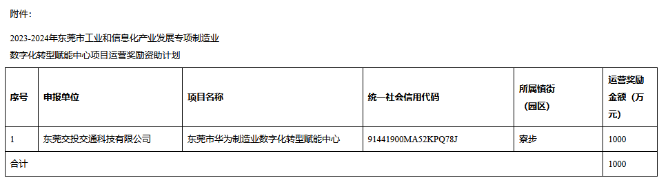 根据《东莞市工业和信息化局关于印发<东莞市工业和信息化产业发展专项资金管理办法>的通知》(东工信〔2022〕215号)、《东莞市工业和信息化专项资金制造业数字化转型赋能中心专题项目实施细则》、《关于申报2023-2024年东莞市工业和信息化产业发展专项制造业数字化转型赋能中心专题项目的通知》的文件精神,我局组织开展了制造业数字化转型赋能中心项目申报工作。经网上申报、项目审核、征求意见等流程,现对2023-2024年东莞市工业和信息化产业发展专项制造业数字化转型赋能中心项目运营奖励进行资助,本次资助计划共1个项目,合计安排资金1000万元(详见附件)。