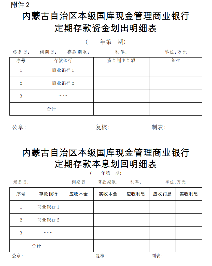 2.内蒙古自治区本级国库现金管理商业银行定期存款 资金划出明细表、定期存款本息划回明细表