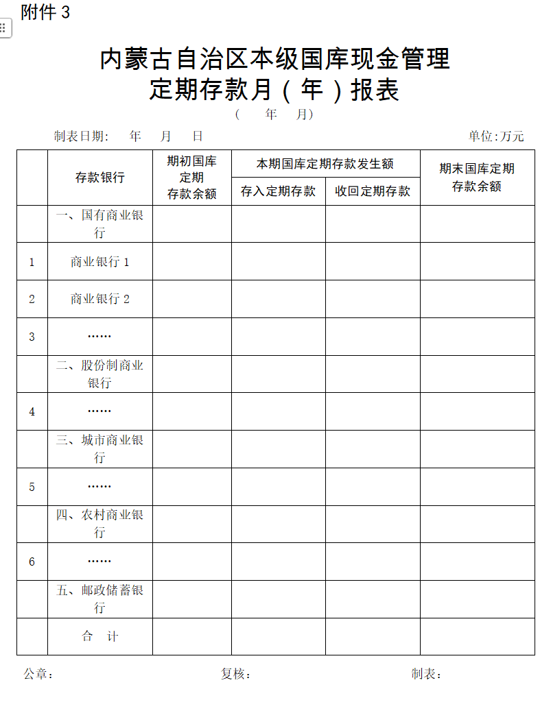 3.内蒙古自治区本级国库现金管理定期存款月(年)报表
