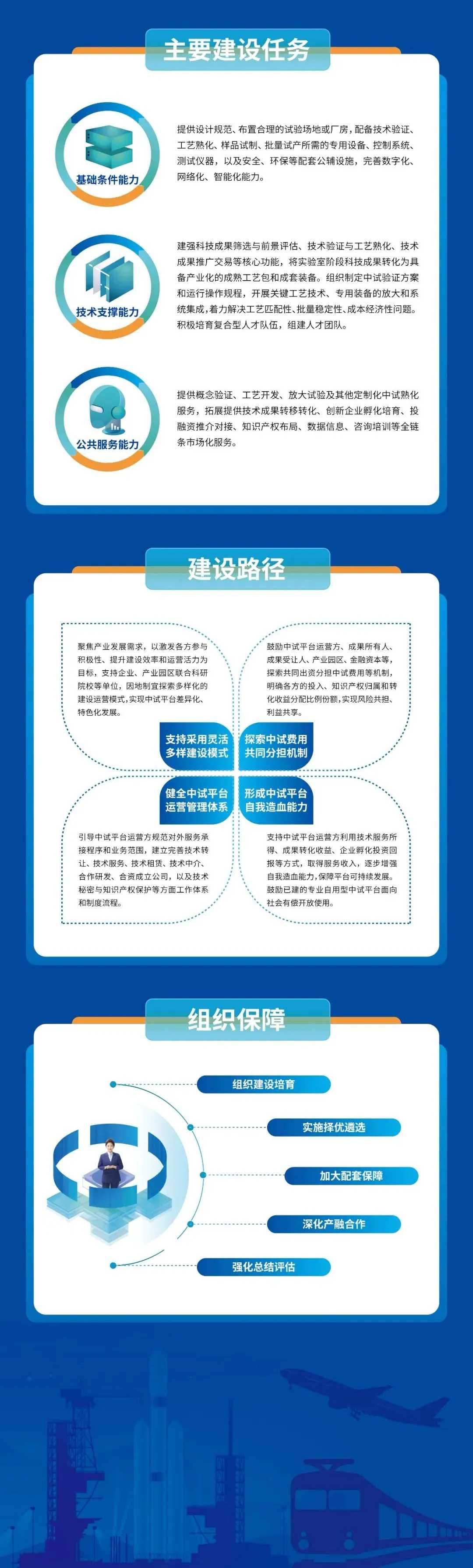 主要包括4方面。一是支持采用灵活多样建设模式。聚焦产业发展需求,以激发各方参与积极性、提升建设效率和运营活力为目标,支持企业、产业园区联合科研院校等单位,因地制宜探索多样化的建设运营模式,实现中试平台差异化、特色化发展。二是探索中试费用共同分担机制。鼓励中试平台运营方、成果所有人、成果受让人、产业园区、金融资本等,探索共同出资分担中试费用等机制,明确各方的投入、知识产权归属和转化收益分配比例份额,实现风险共担、利益共享。三是健全中试平台运营管理体系。引导中试平台运营方规范对外服务承接程序和业务范围,建立完善技术转让、技术服务、技术租赁、技术中介、合作研发、合资成立公司,以及技术秘密与知识产权保护等方面工作体系和制度流程。四是形成中试平台自我造血能力。支持中试平台运营方利用技术服务所得、成果转化收益、企业孵化投资回报等方式,取得服务收入,逐步增强自我造血能力,保障平台可持续发展。鼓励已建的专业自用型中试平台面向社会有偿开放使用。