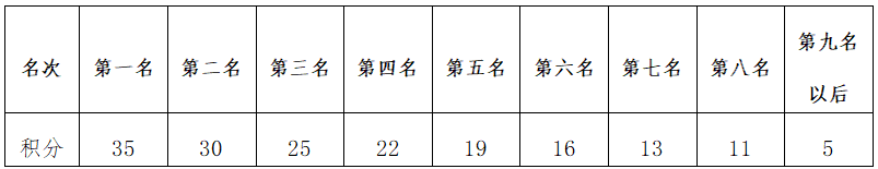 4.团体:分别以7个单项最好名次换算积分之和录取名次。超过8支队伍的录取前八名,不足8支队伍的按实际参赛队伍录取名次。前八名颁发证书,前三名颁发锦旗。