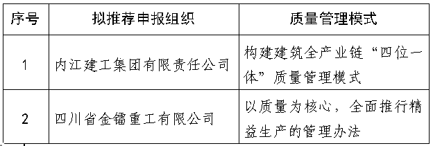 内江市“第三届四川省天府质量奖”拟推荐申报名单