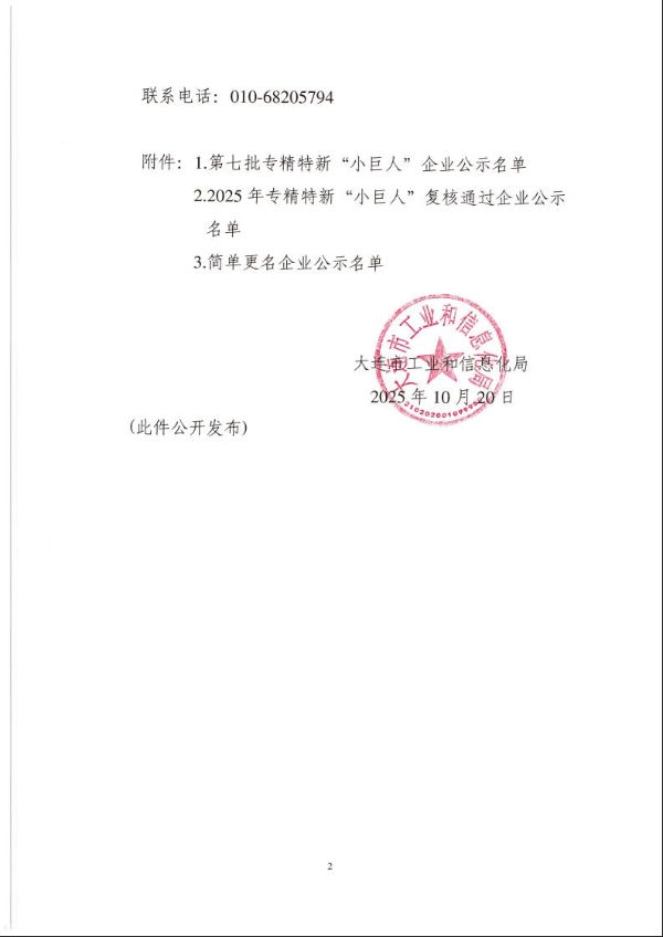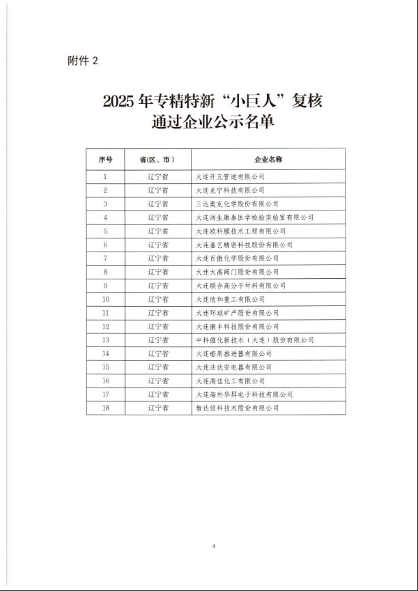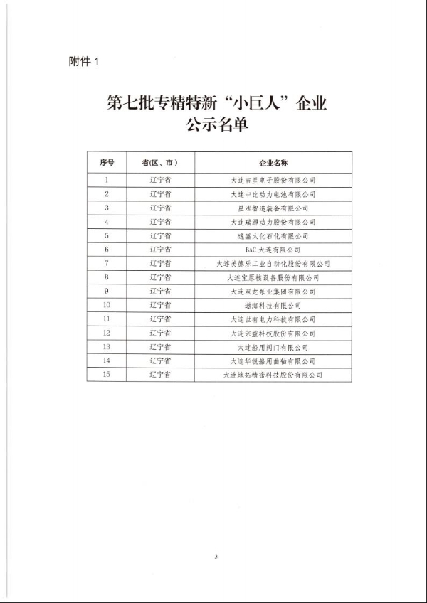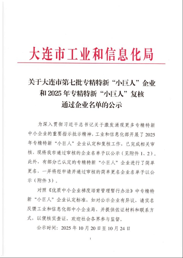 关于大连市第七批专精特新“小巨人”企业和2025年专精特新“小巨人”复核通过企业名单的公示