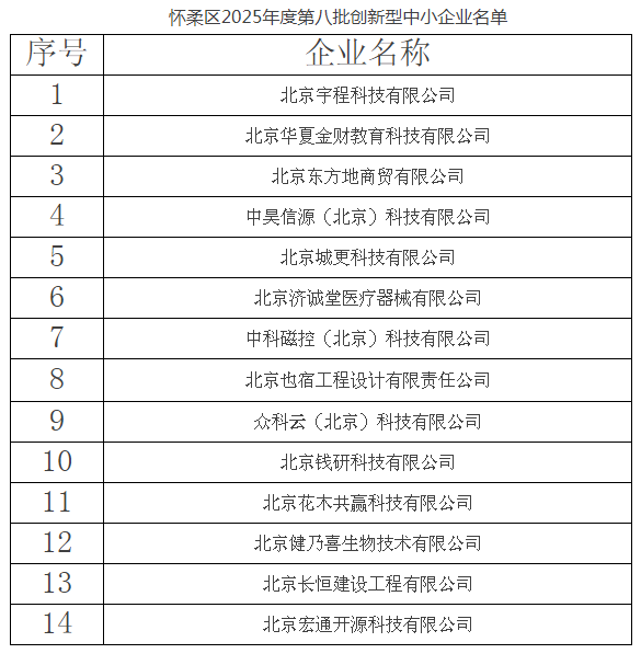 按照北京市优质中小企业梯度培育相关政策要求,我局组织开展了怀柔区2025年度第八批创新型中小企业征集及评审工作。前期已将拟认定名单向社会公示,经相关程序,怀柔区2025年度第八批创新型中小企业名单已经确定,现予以公告。