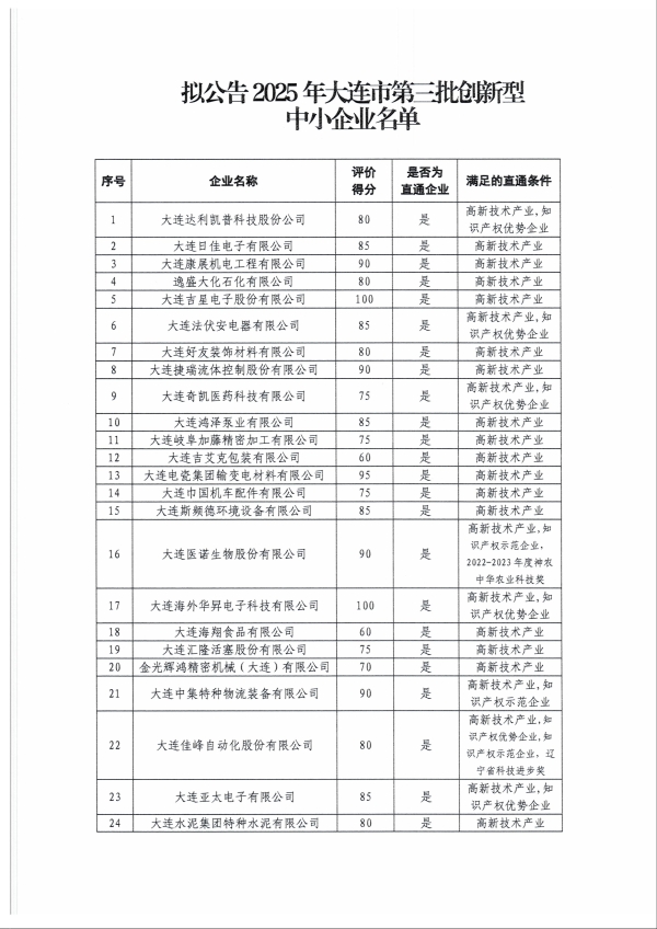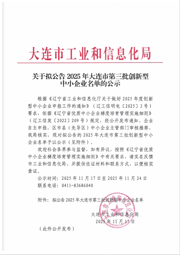 关于拟公告2025年大连市第三批创新型中小企业名单的公示