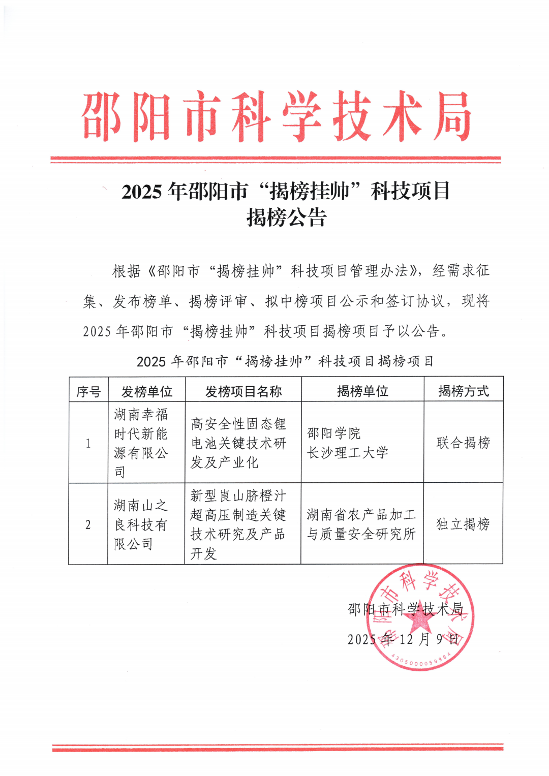 2025年邵阳市“揭榜挂帅”科技项目揭榜公告
