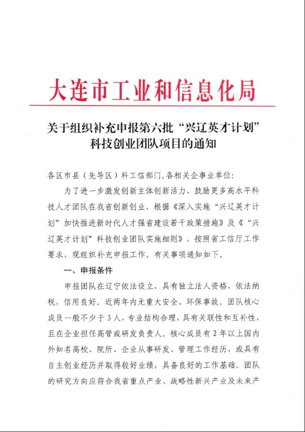 关于组织补充申报第六批“兴辽英才计划”科技创业团队的通知