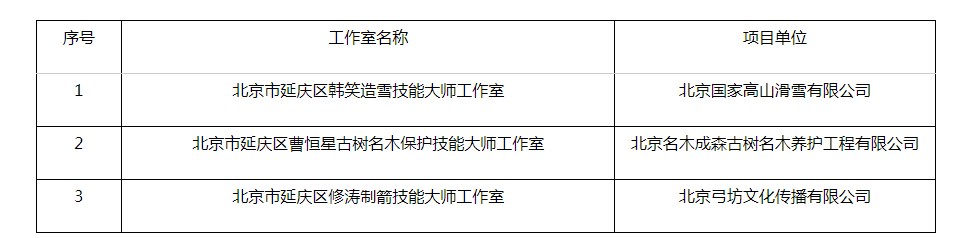 按照北京市延庆区就业工作领导小组办公室《关于印发<延庆鹊桥培训实施方案>的通知》(京延就发〔2022〕7号)工作部署,北京市延庆区人力资源和社会保障局聚焦延庆区冰雪、园艺、体育、无人机、旅游等产业,推行名师带徒制度,发挥优秀高技能人才在技术攻关、技术创新、技术交流、传授技艺和实现绝技绝活代际传承、技术成果转化中的引领作用,创建延庆区技能大师工作室。通过对企业提交材料初审、聘请专家组评审,最终评选出3家延庆区技能大师工作室,公示如下:
