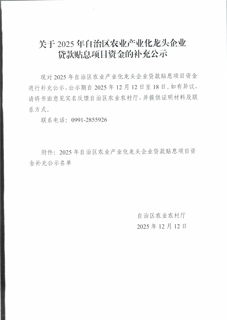 关于2025年自治区农业产业化龙头企业贷款贴息项目资金的补充公示