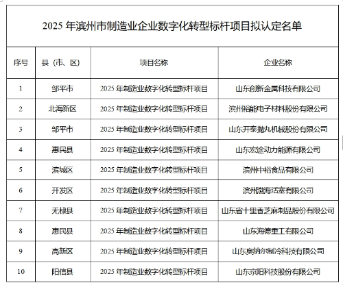 根据《滨州市工业和信息化局滨州市财政局关于印发<滨州市制造业企业“智改数转”市级财政激励政策实施细则>的通知》等文件,市工业和信息化局组织开展了2025年度滨州市制造业企业数字化转型标杆项目申报工作。经企业自愿申报、市县初审、专家评审,现将2025年滨州市制造业企业数字化转型标杆项目拟认定名单(见附件)予以公示。公示期为2025年12月15日-2024年12月19日。