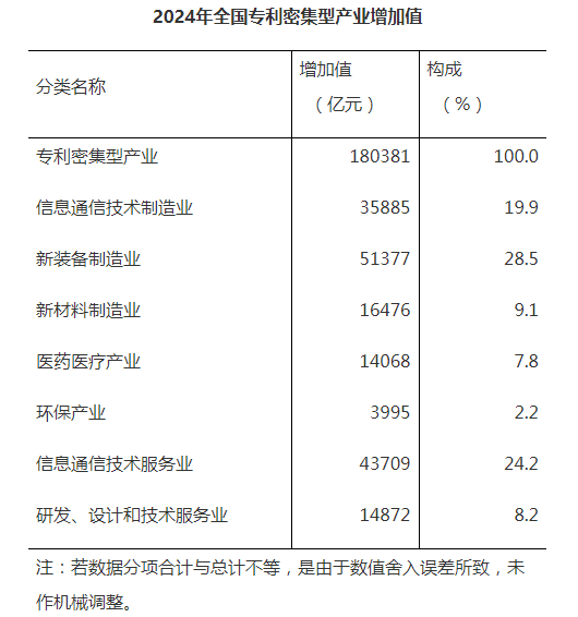 经核算,2024年全国专利密集型产业增加值为180381亿元,占国内生产总值(GDP)的比重为13.38%,比上年提高0.34个百分点。