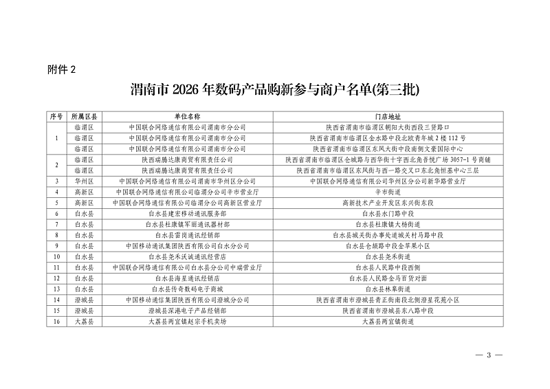 渭南市2026年数码产品购新参与企业及个体商户(第三批)公示