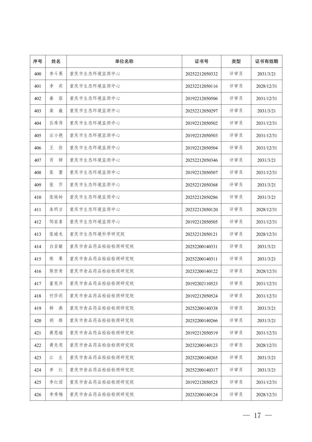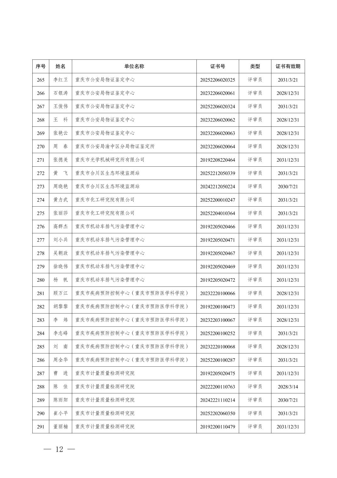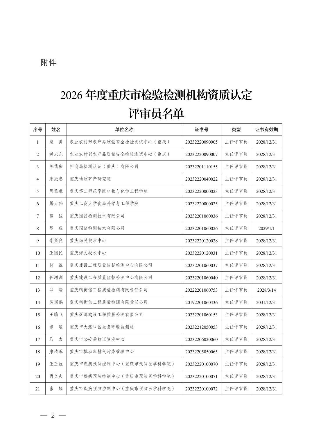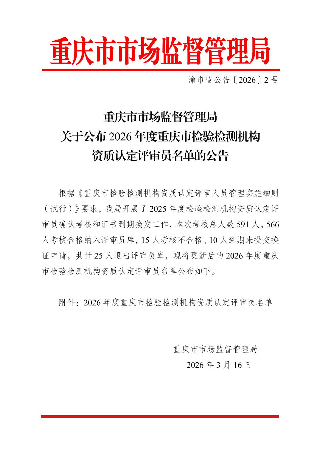 重庆市市场监督管理局关于公布2026年度重庆市检验检测机构资质认定评审员名单的公告