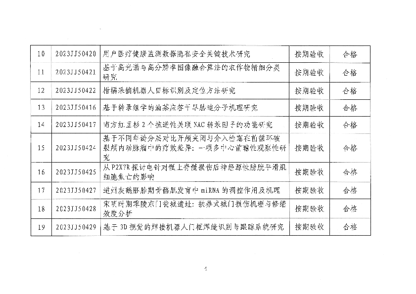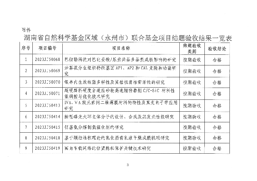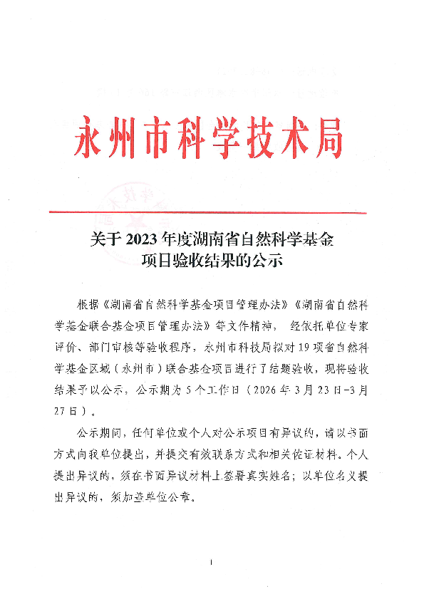 关于2023年度湖南省自然科学基金项目验收结果的公示