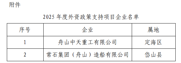 根据《舟山市人民政府办公室关于印发舟山市推进开放提能升级消费提质扩容若干政策的通知》(舟政办发[2025]19号),按照《舟山市商务局关于开展“更大力度吸引和利用外资”奖补政策项目申报工作的通知》(舟商务资[2025]2号)要求,经企业自主申报和各县(区)商务局初审,市商务局审核确定舟山中天重工有限公司、常石集团(舟山)造船有限公司这两家企业为2025年度外资政策支持项目。