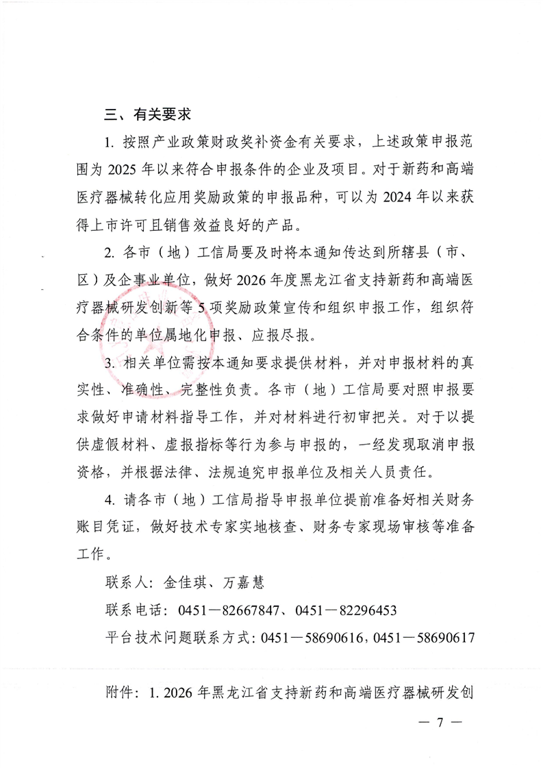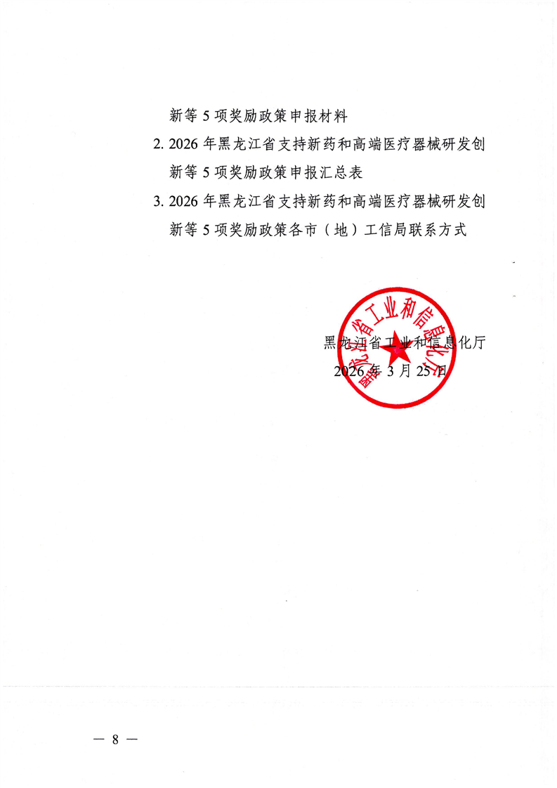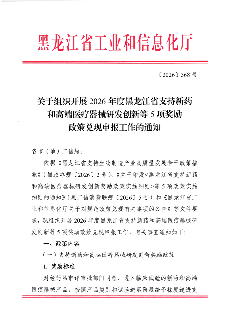 关于组织开展2026年度黑龙江省支持新药和高端医疗器械研发创新等5项奖励政策兑现申报工作的通知