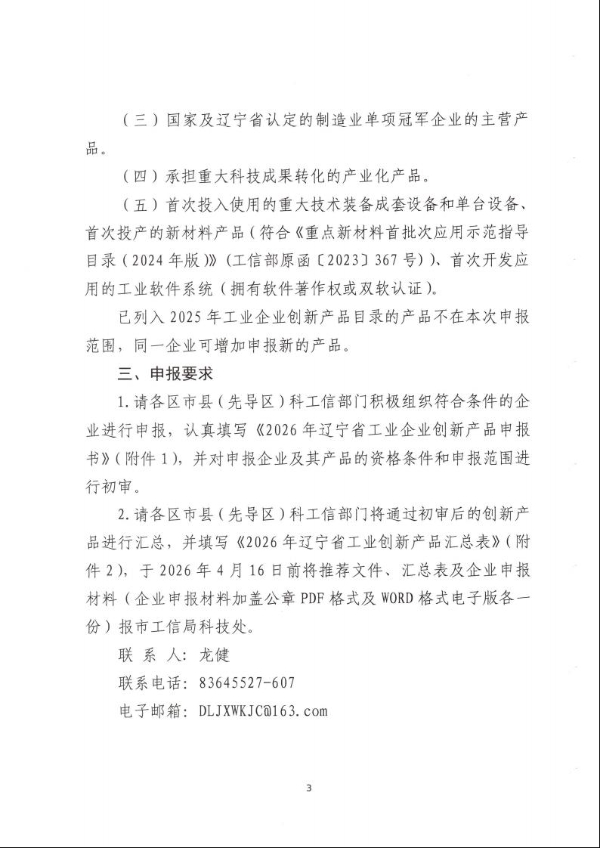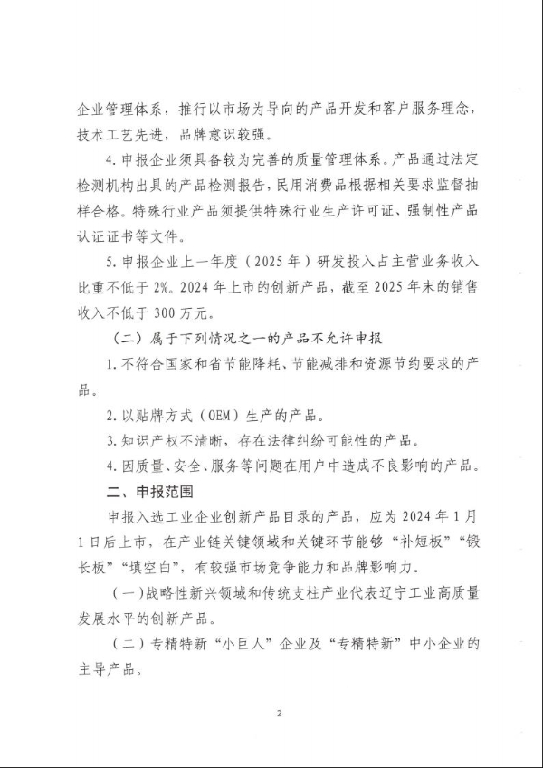 关于申报2026年度辽宁省工业企业创新产品的通知
