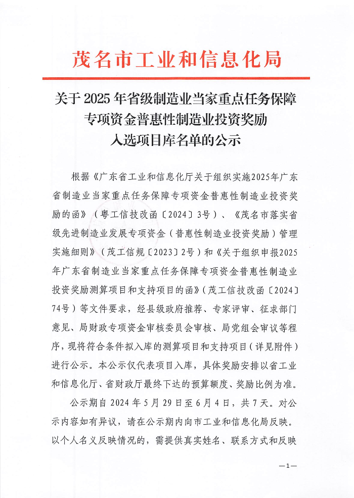 茂名市工业和信息化局关于2025年省级制造业当家重点任务保障专项资金普惠性制造业投资奖励入选项目库名单的公示