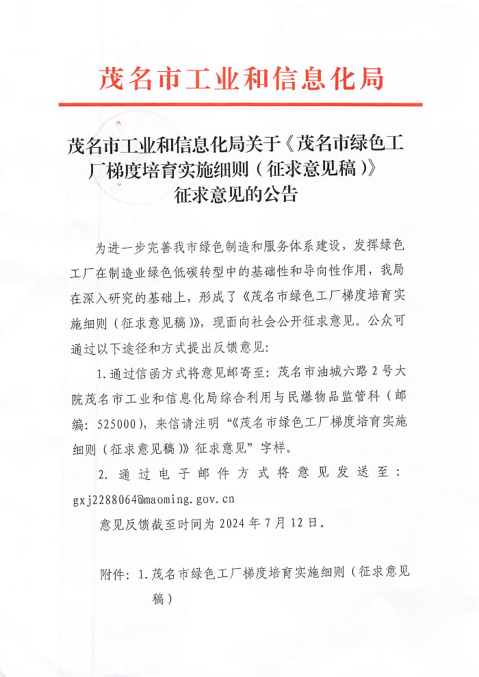茂名市工业和信息化局关于《茂名市绿色工厂梯度培育实施细则(征求意见稿)》征求意见的公告