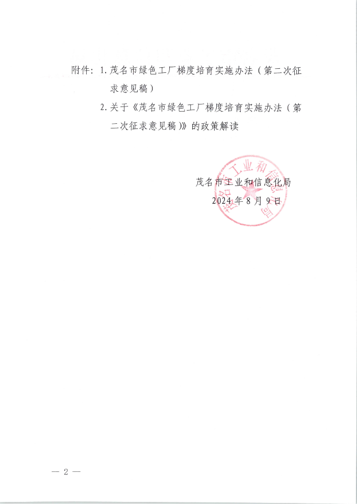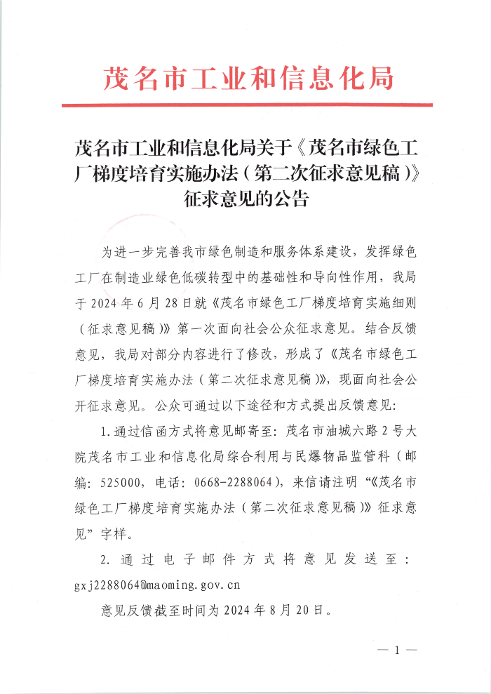 茂名市工业和信息化局关于《茂名市绿色工厂梯度培育实施办法(第二次征求意见稿)》征求意见的公告