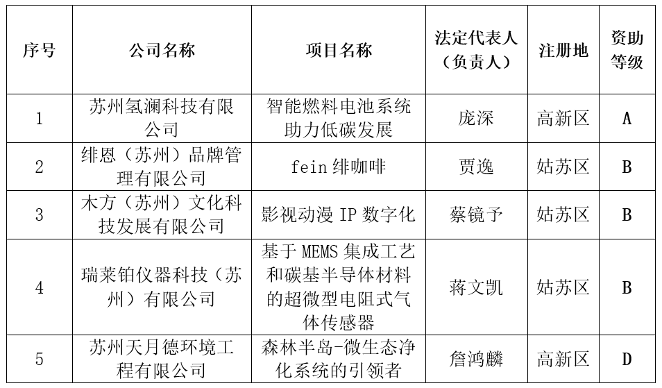 根据《市政府关于做好当前和今后一段时期就业创业工作的实施意见》(苏府〔2017〕158号)、《市政府办公室关于转发苏州市创业引导性资金使用管理办法的通知》(苏府〔2018〕144号)和《关于印发<苏州市区创业大赛优秀项目资助实施办法(试行)>的通知》(苏人保就管〔2018〕20号)文件要求,我市开展2024年度苏州市区创业大赛优秀项目资助工作,经个人申请、区级初审、实地走访、市级复审、信用查询、专家评审等环节,拟确定5个项目获得2024年度苏州市区创业大赛优秀项目资助,现将具体名单和奖励等级予以公示: