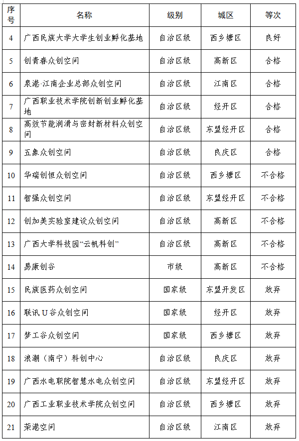 根据《关于印发南宁市科技企业孵化器认定管理办法的通知》(南科规〔2024〕3号)、《关于印发南宁市众创空间认定管理办法的通知》(南科规〔2024〕4号)规定,市科技局开展了2023年度科技企业孵化器、众创空间绩效考评工作。现将考核结果通报如下: