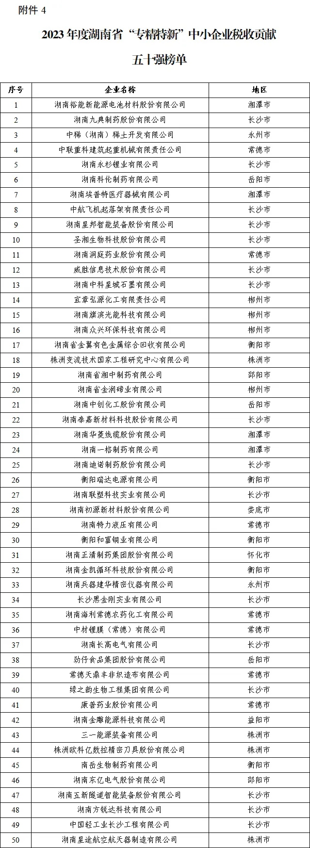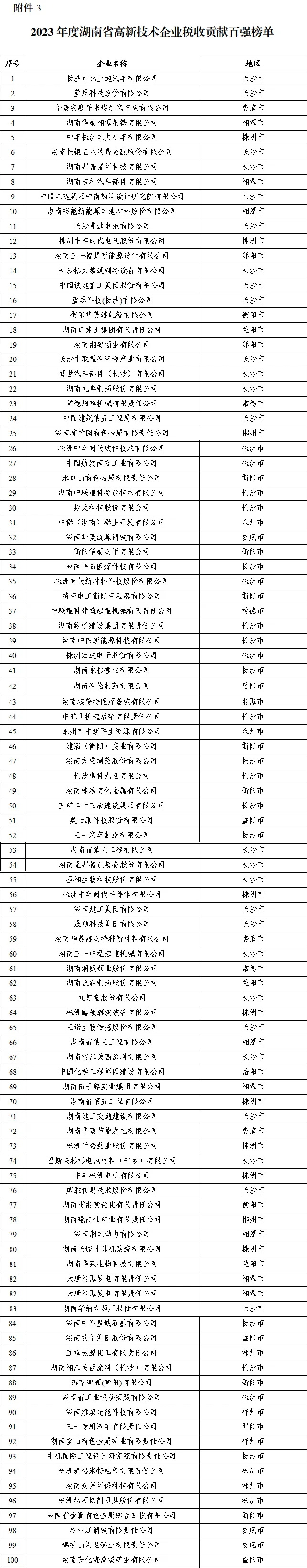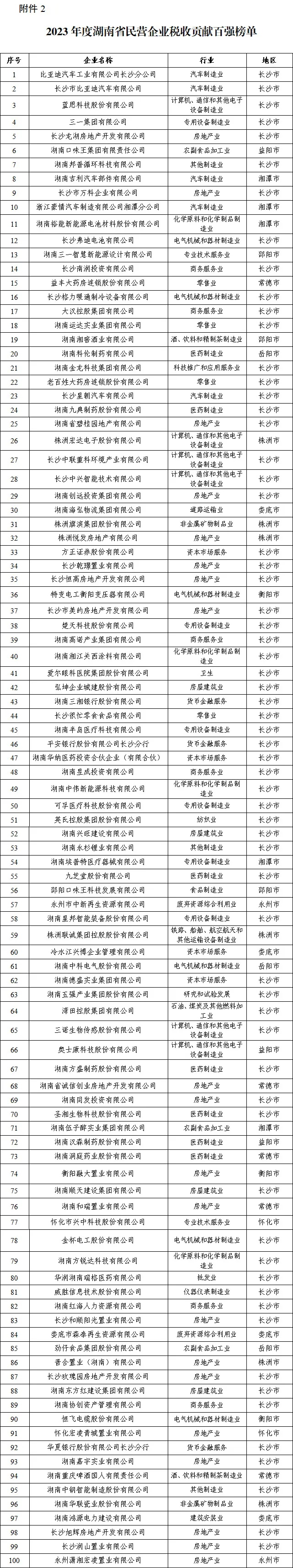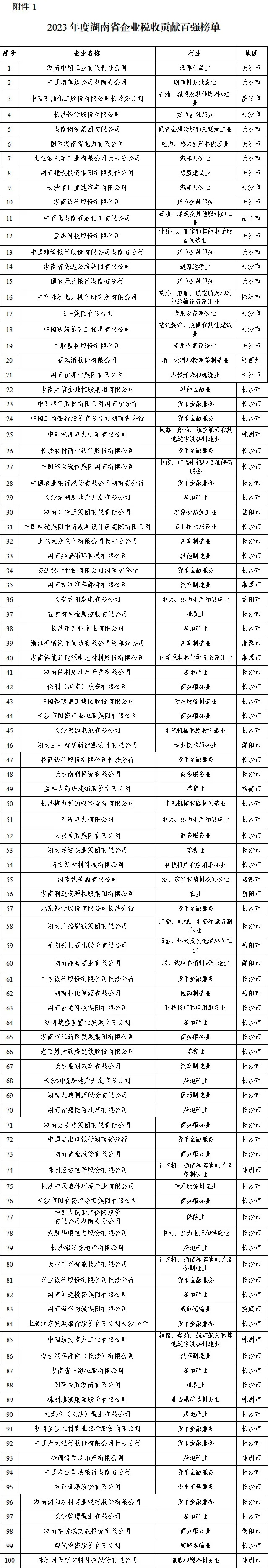 为在全社会营造依法经营、诚信纳税的良好氛围,加大重点税源企业宣传力度,促进我省经济社会高质量发展,根据省委办公厅、省政府办公厅有关文件精神,经相关部门联合审查,初步确认2023年度“湖南省企业税收贡献百强”“湖南省民营企业税收贡献百强”“湖南省高新技术企业税收贡献百强”“湖南省‘专精特新’中小企业税收贡献五十强”四张榜单,现予公示。