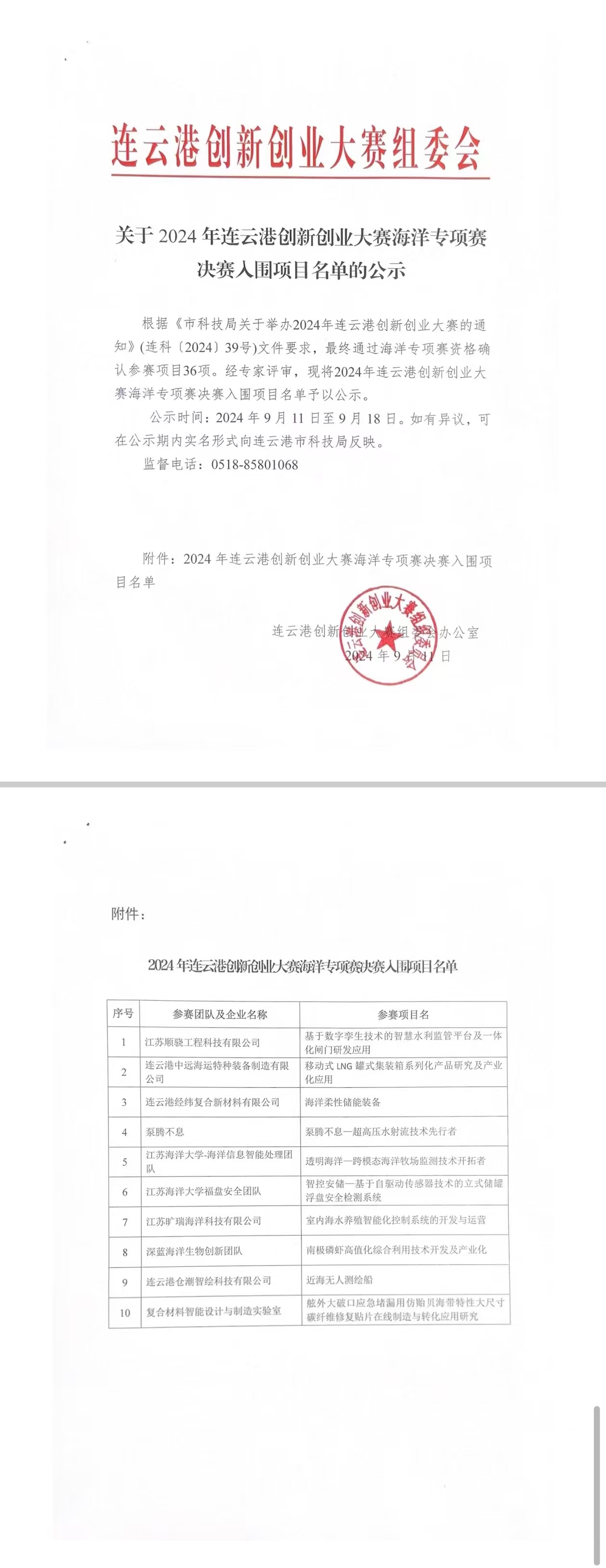 关于2024年连云港创新创业大赛海洋专项赛决赛入围项目名单的公示