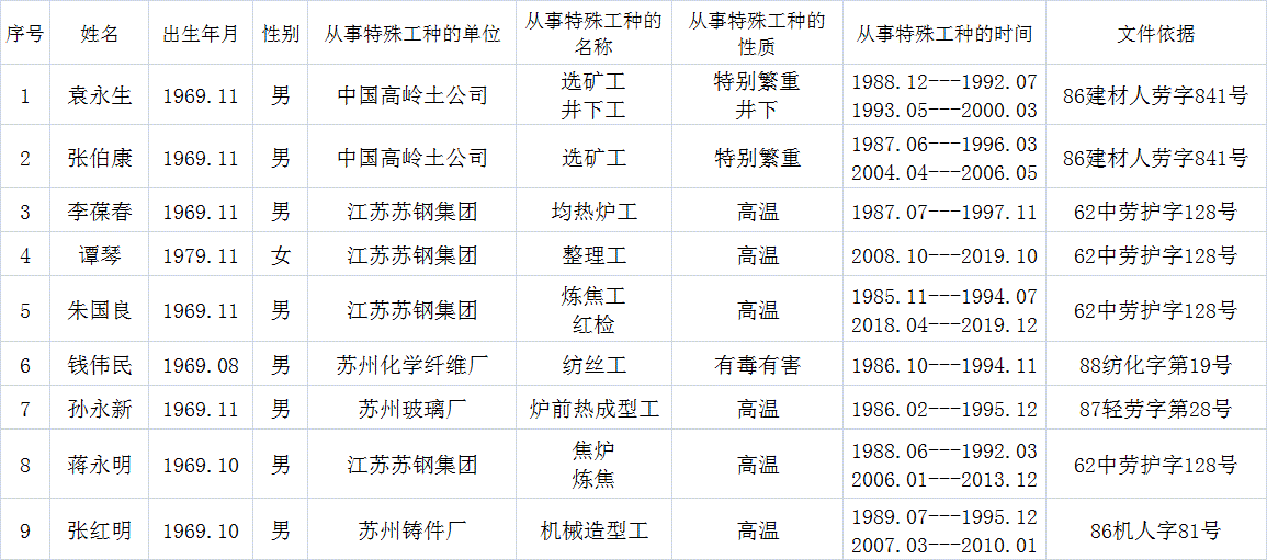 根据人社部发〔2018〕73号文件、苏人社发〔2018〕393号文件规定,现将2024年11月我市特殊工种提前退休人员基本情况予以公示,公示时间5个工作日(2024年11月8日至2024年11月15日)。如有异议,请在公示期内向12333反映情况。