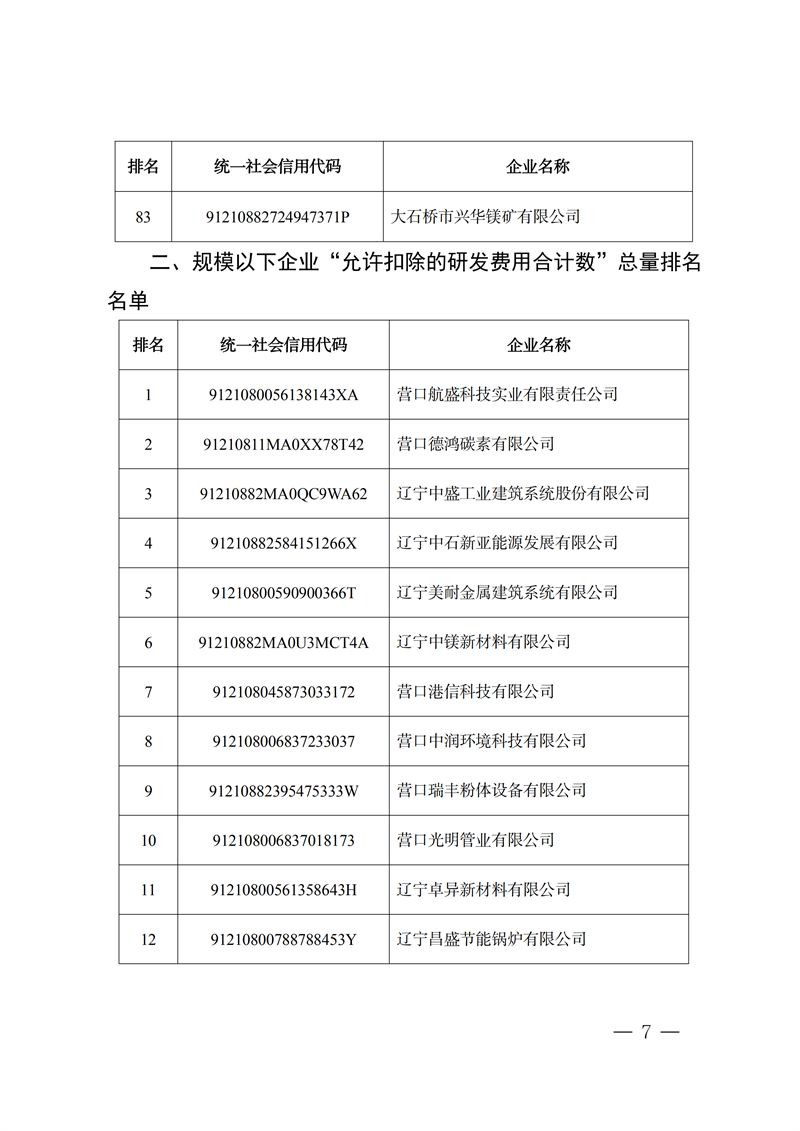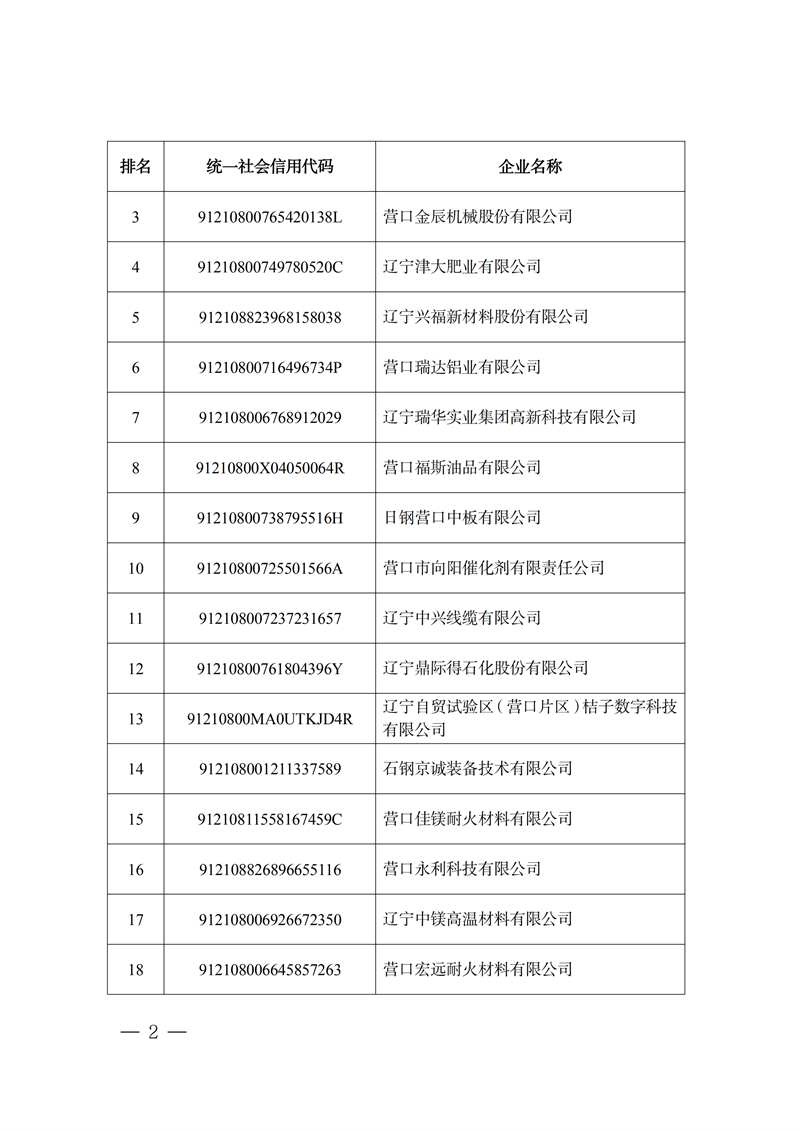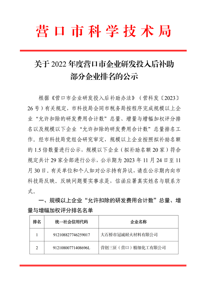 关于2022年度营口市企业研发投入后补助部分企业排名的公示
