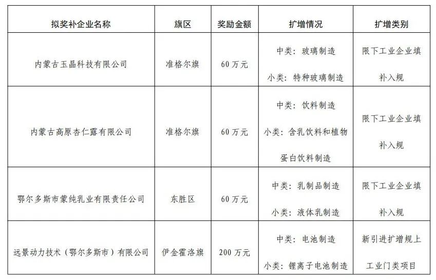 根据《鄂尔多斯市扩增工业门类促进高质量发展行动方案》、《鄂尔多斯市扩增工业门类促进高质量发展专项资金管理办法》及《关于组织申报2023年鄂尔多斯市扩增工业门类促进高质量发展专项资金项目的通知》文件要求,经企业申报、形式审查、专家评审、征求相关职能部门意见等流程,现将评审结果予以公示。公示期为2023年12月2日至2023年12月9日。公示期间,如有异议,请于2023年12月9日17:00前反映,逾期不予受理。以单位名义反映情况的材料要加盖单位公章,以个人名义反映情况的材料要具实名并附联系方式。对匿名或无具体事实根据的异议,不予受理。