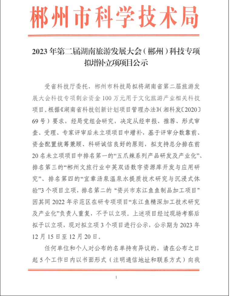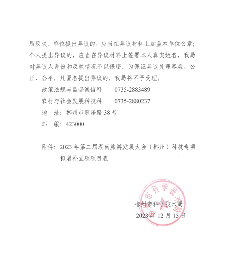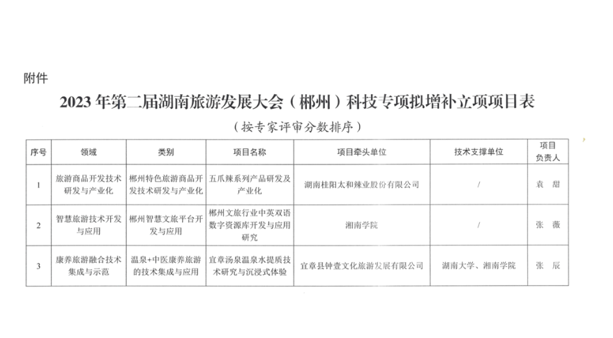 2023年第二届湖南旅游发展大会(郴州)科技专项拟增补立项项目公示