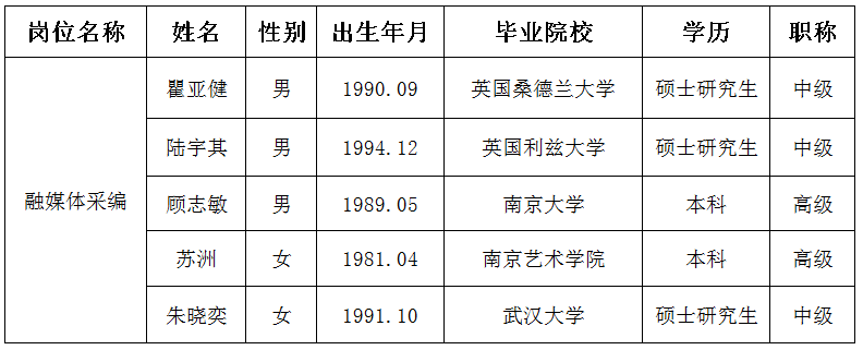 根据《苏州日报社2024年公开招聘高层次新闻人才公告》,经过面试、体检和考核合格,拟录用以下5名同志,现公示如下: